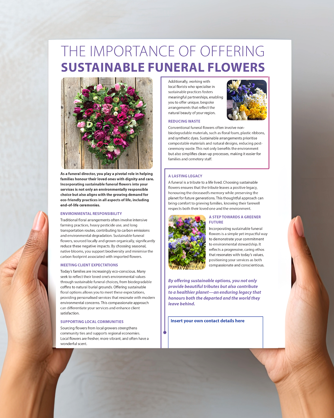 This free download is a PDF to promote the benefits for funeral directors of offering sustainable funeral flower options to their clients. It has an editable box for you to add your own contact details.