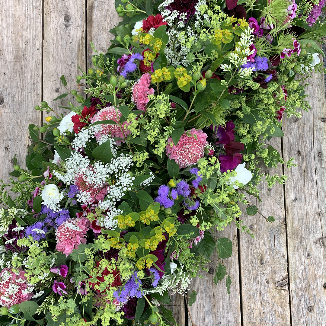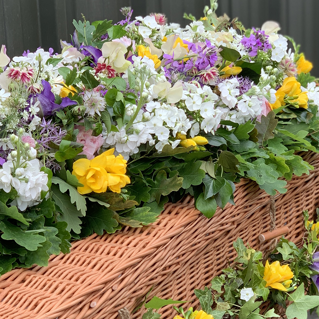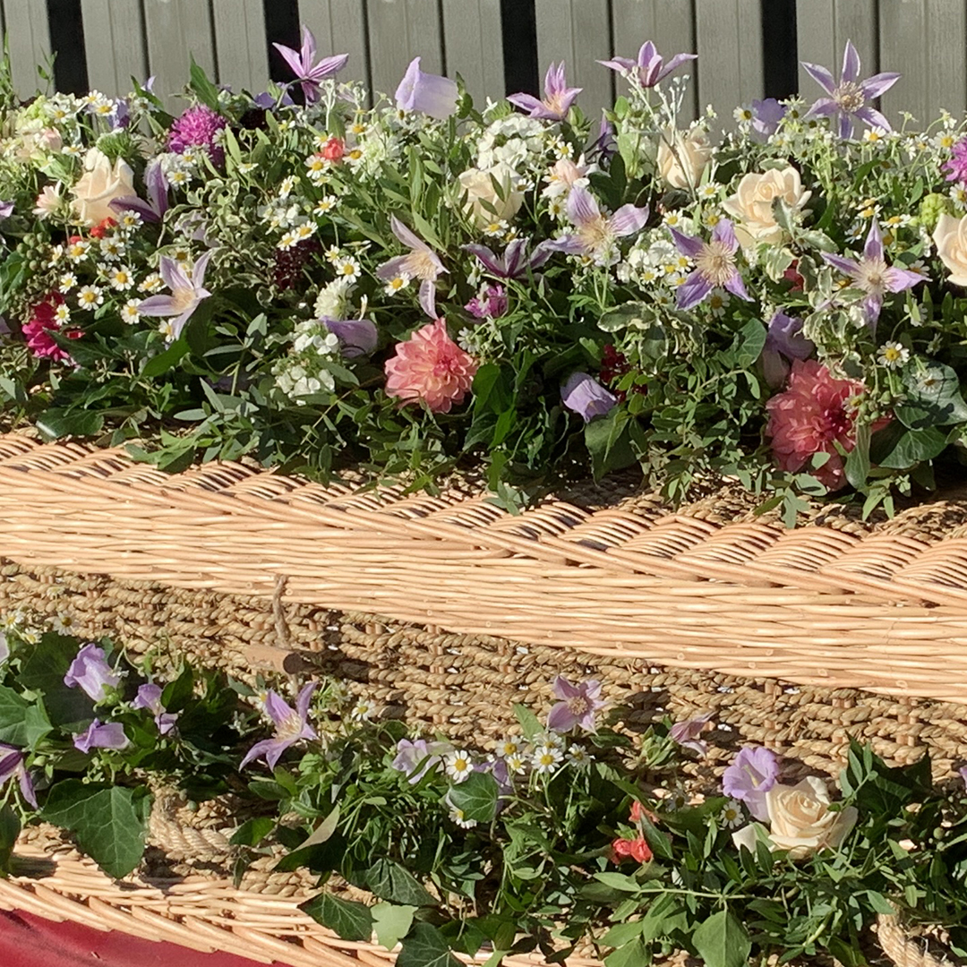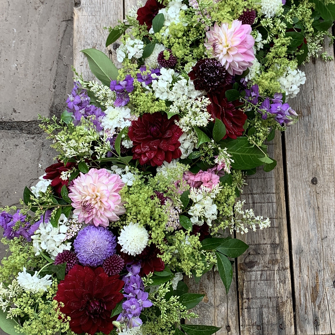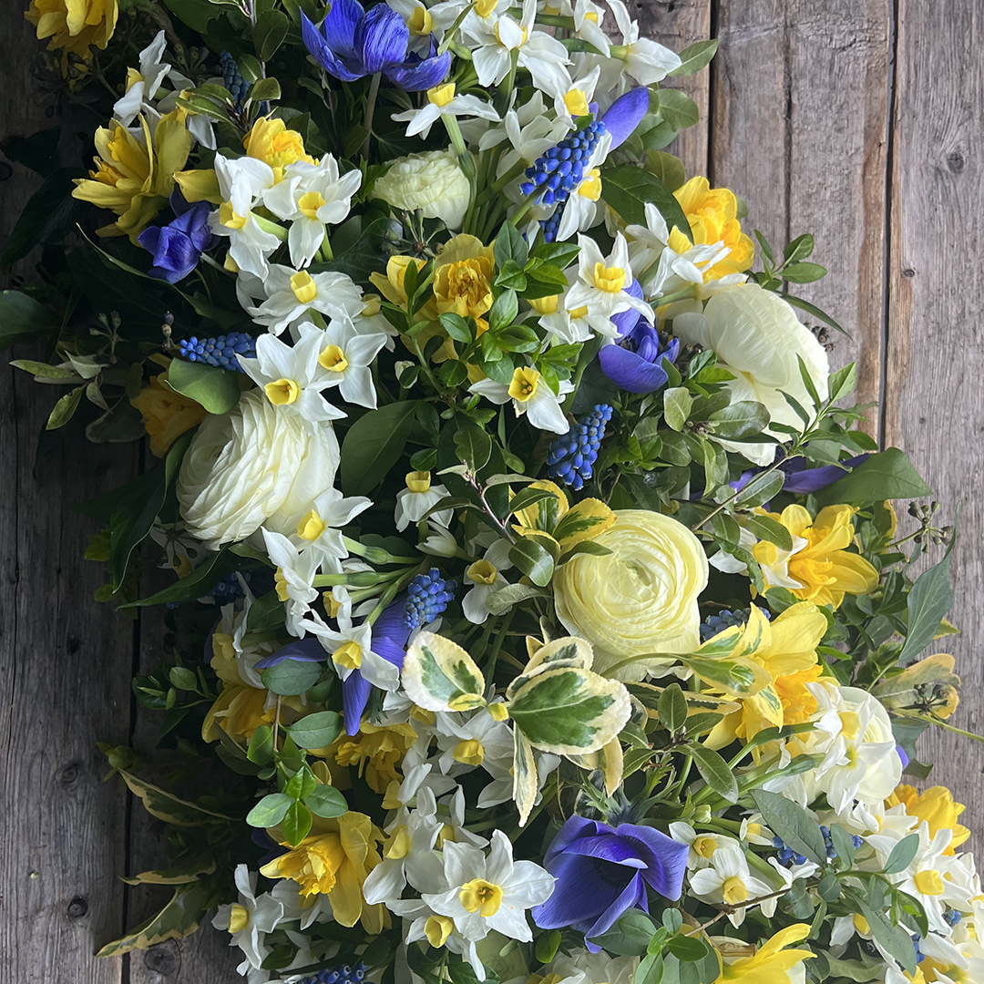 A common requirement these days is for flowers to be shared after the funeral so by creating the coffin blanket in modules, usually three or four, the flowers can be taken away by different family members, left on the grave or used to decorate a table at the wake.