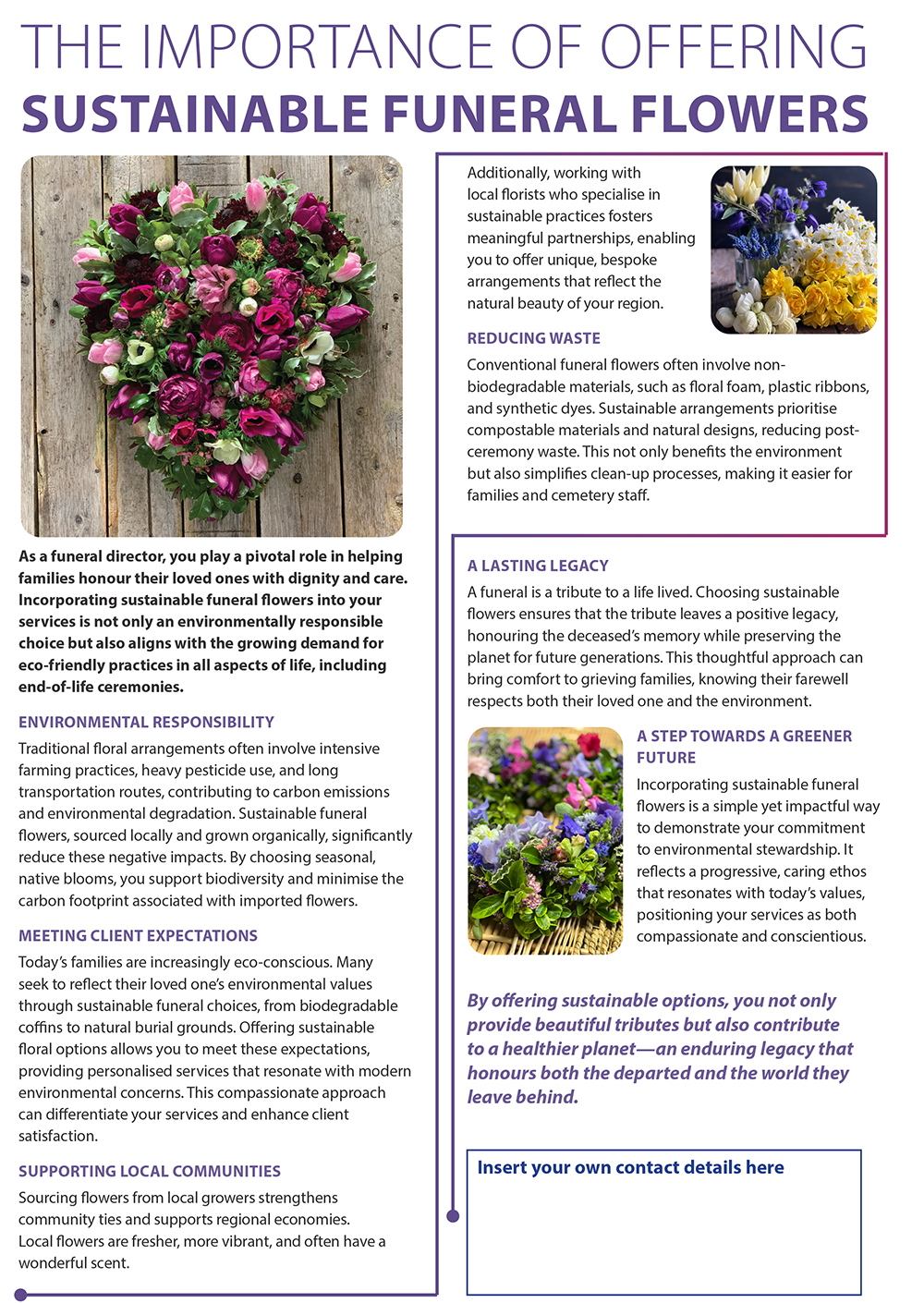 This A4 leaflet has been designed to highlight the benefits of offering the option of sustainable funeral flowers. It is high resolution PDF which can be used to email prospective clients or can be printed out.